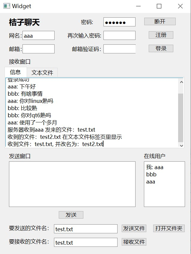 该聊天软件是在qt6里用c++编写的程序。程序功能包括连接服务器,用户注册,用户登录,文字聊天,发送文本文件等功能。